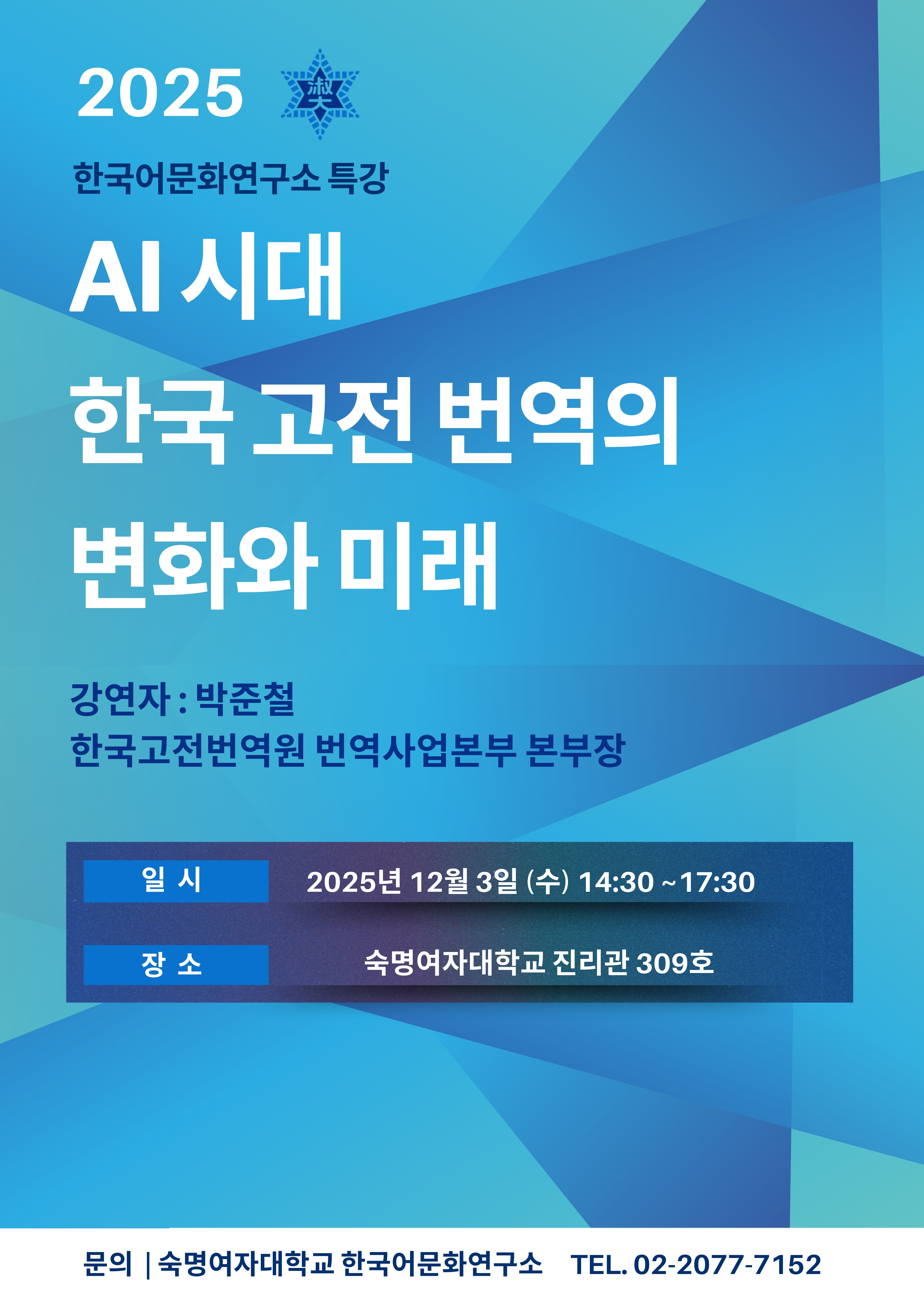 - 일 시: 2025년 12월 3일 (수) 16:30 ~17:30 - 장 소: 숙명여자대학교 진리관 309호 - 강연자 : 박준철 한국고전번역원 번역사업본부 본부장
